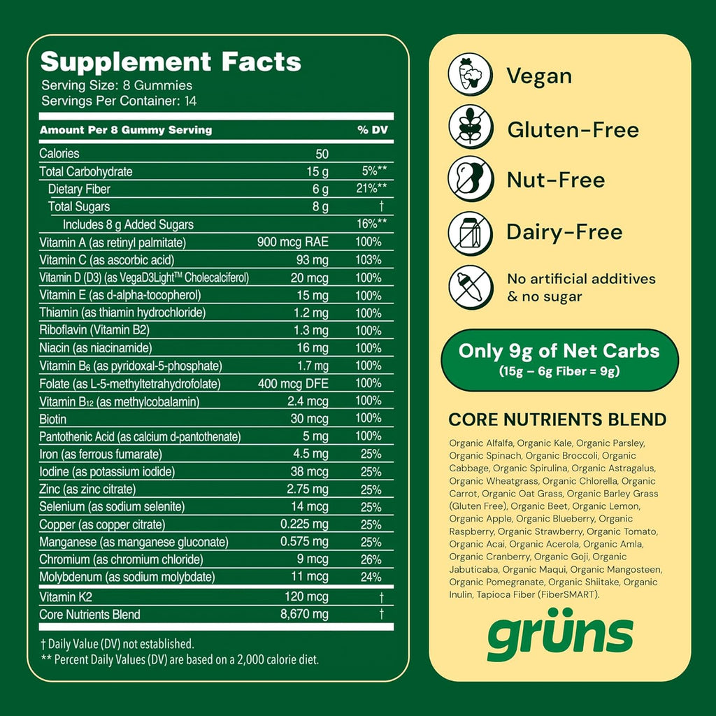 Grüns is formulated to help nutrient deficient people fill the nutrient gaps with our snackable, packable gummies. Enjoy the beary best way to get comprehensive nutrition and fill your nutrition gaps every day with Grüns!